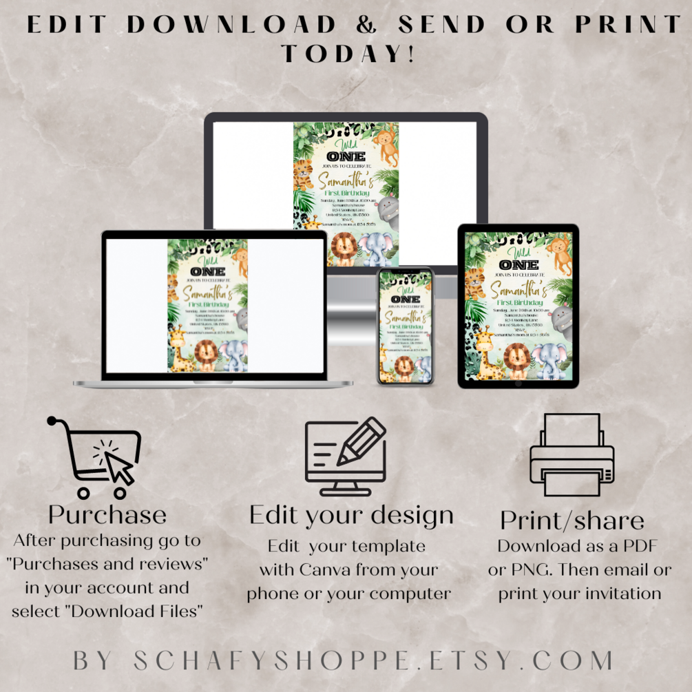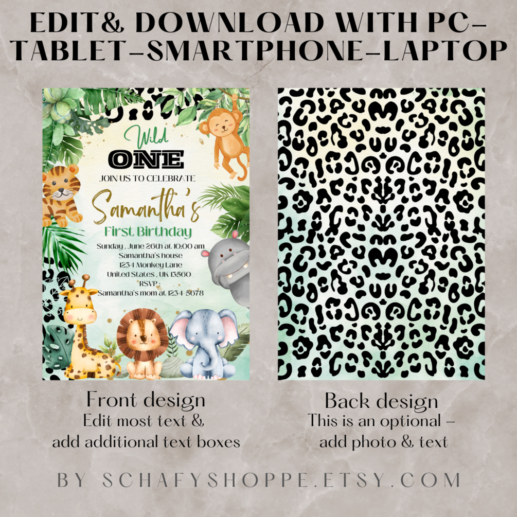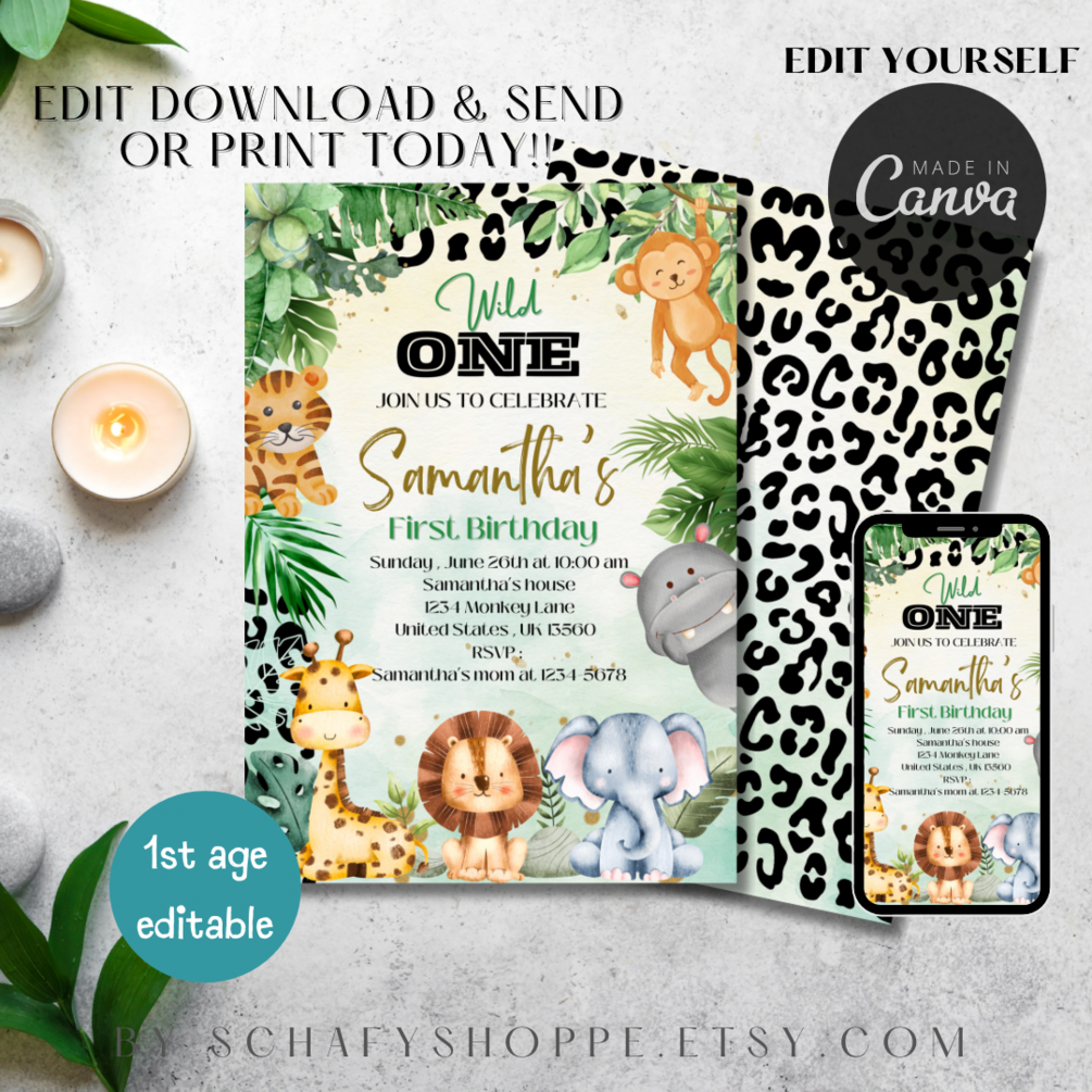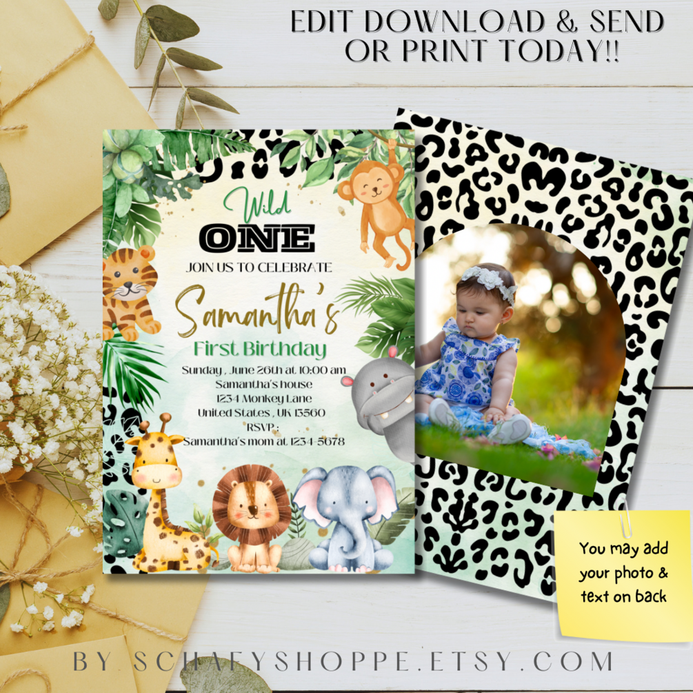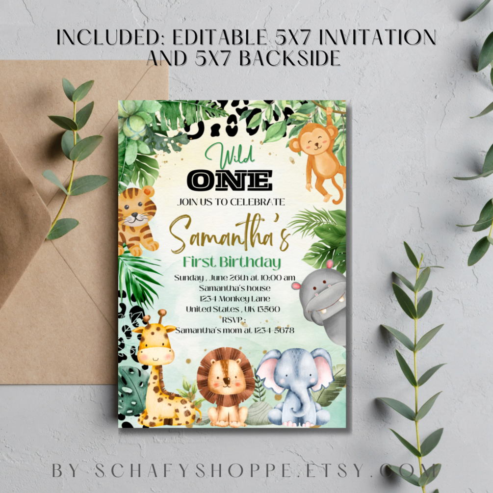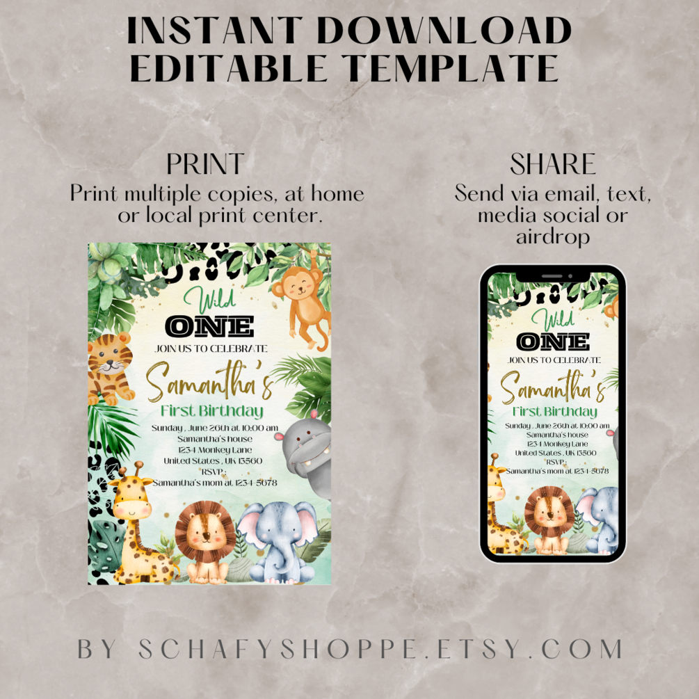 Editable Wild One Birthday Invitation Safari Animal 1st Birthday Invitation Jungle Theme Birthday invite Editable Instant Download
