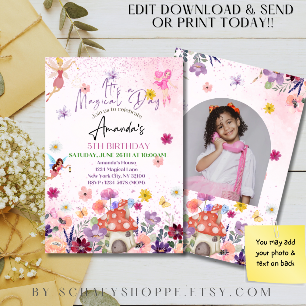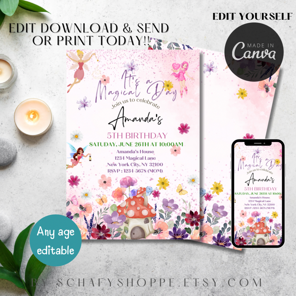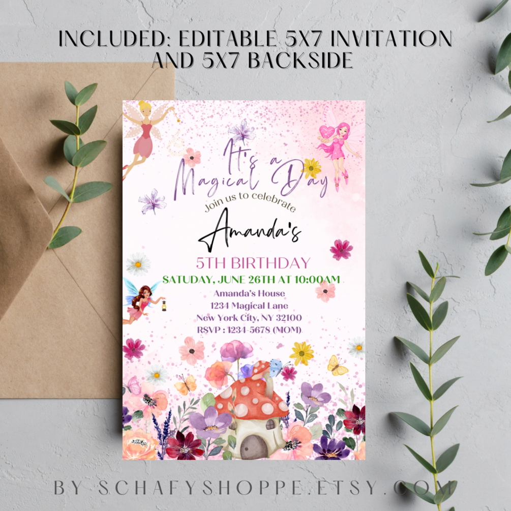 Editable Purple Pink Birthday Invitation Fairy Party Magical Floral Princess Party Mushroom house Printable Instant Download