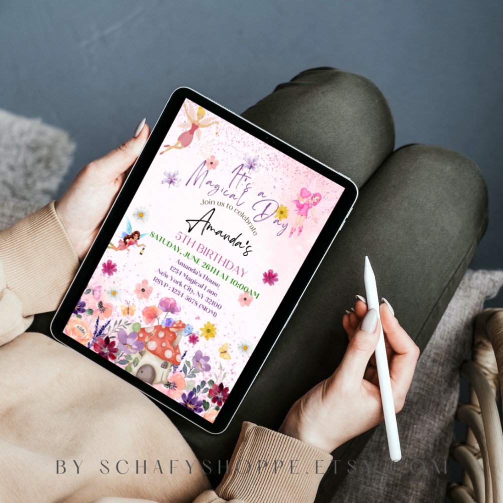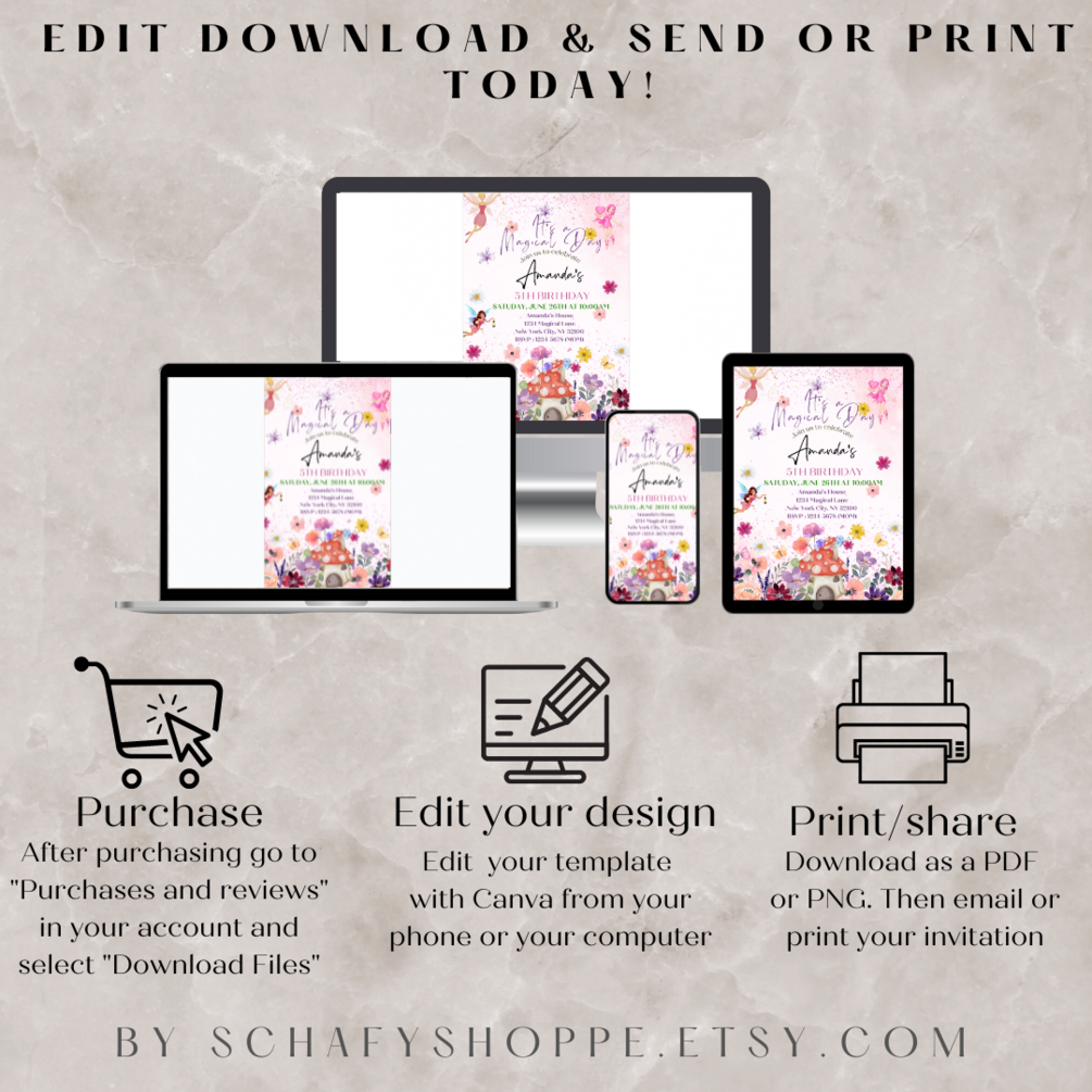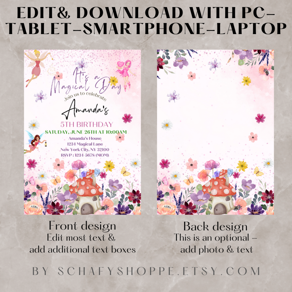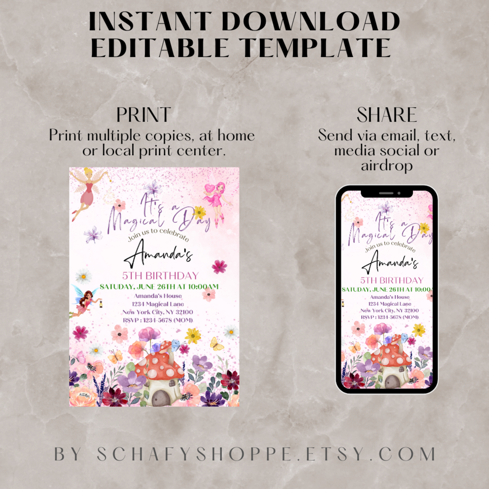 Editable Purple Pink Birthday Invitation Fairy Party Magical Floral Princess Party Mushroom house Printable Instant Download