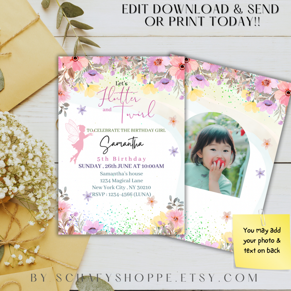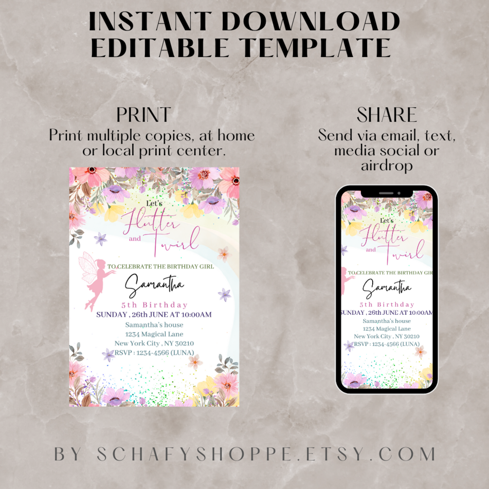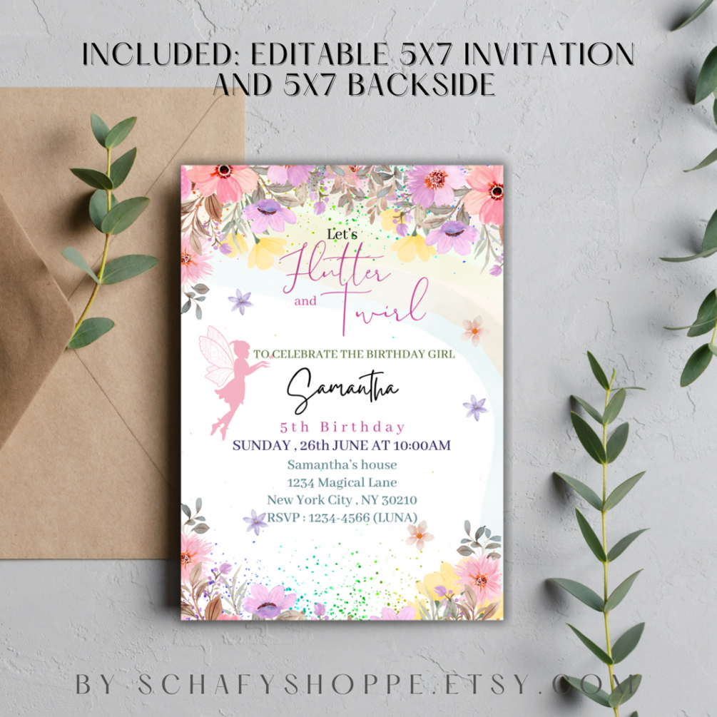 Editable Flutter and twirl Birthday Invitation Fairy Party Magical Floral Princess Party Whimsical Pixie Fairy Printable Instant Download