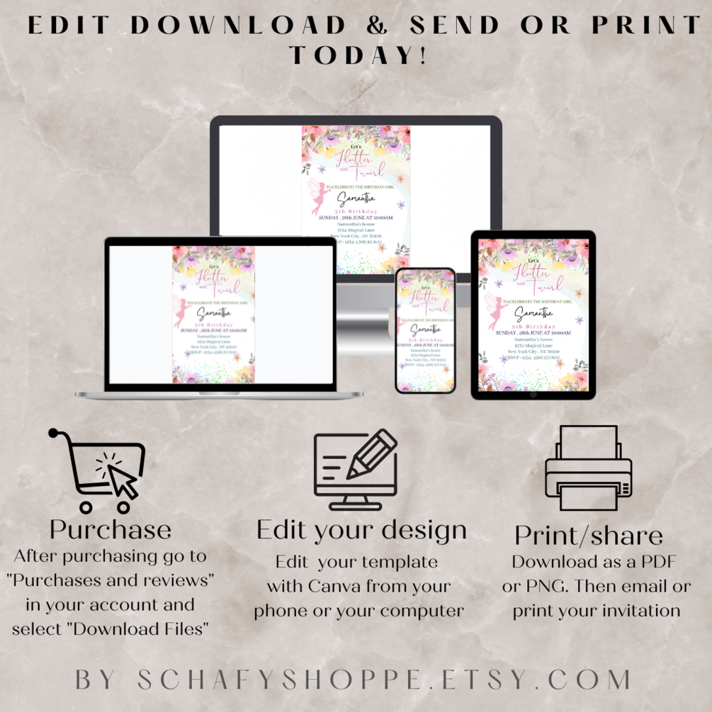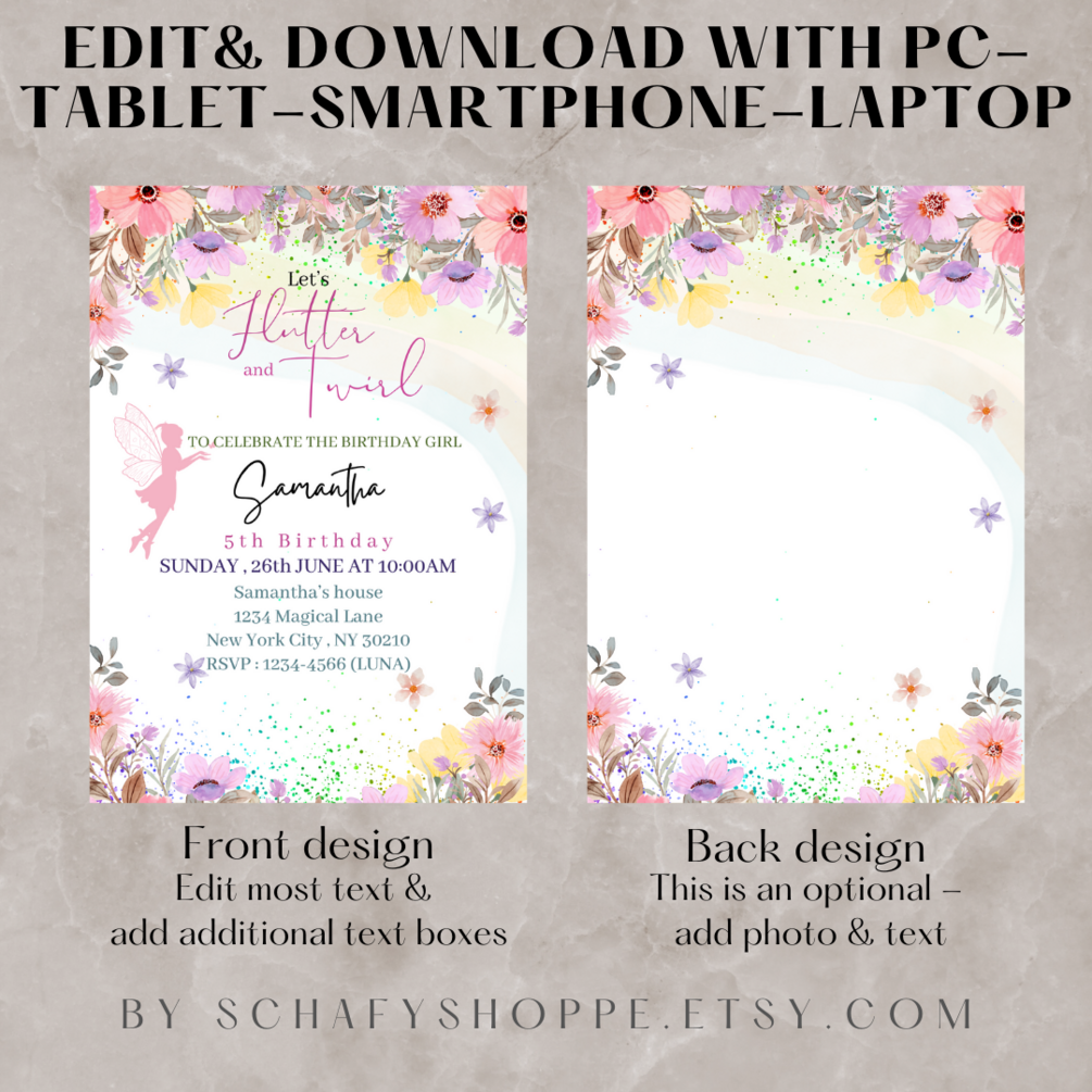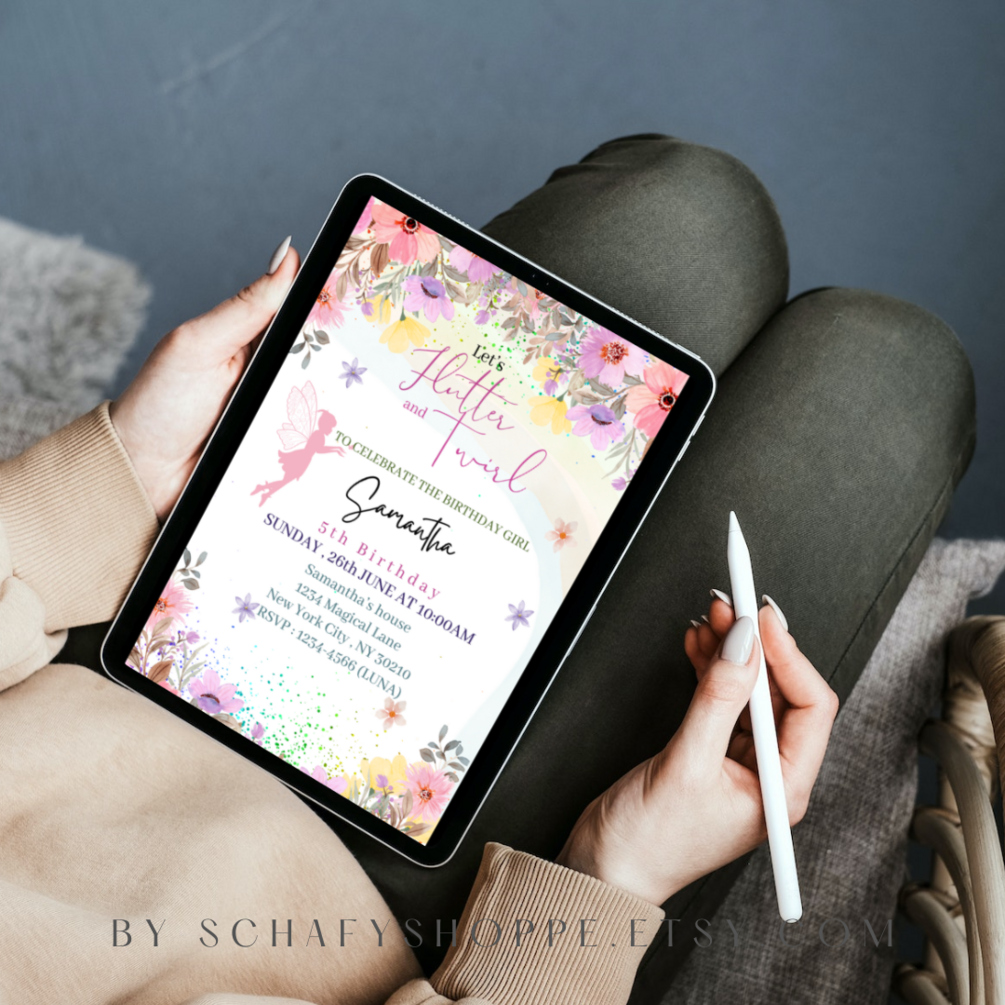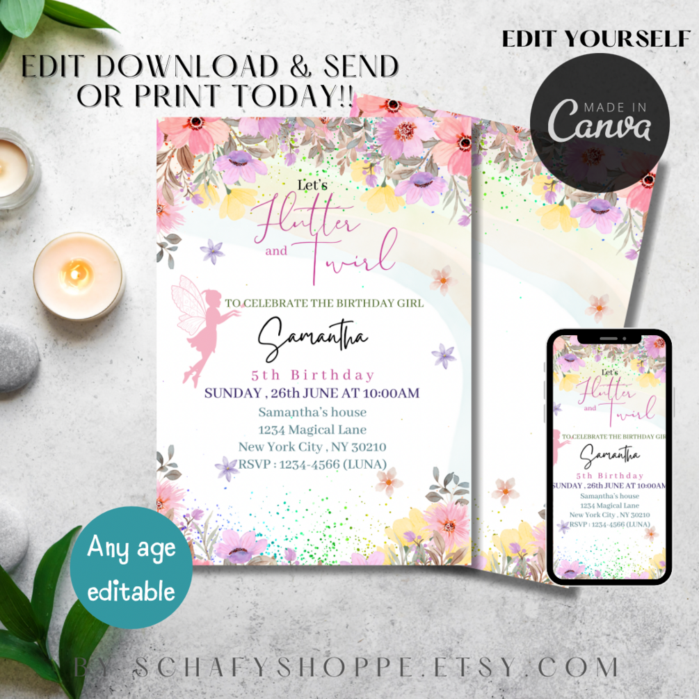 Editable Flutter and twirl Birthday Invitation Fairy Party Magical Floral Princess Party Whimsical Pixie Fairy Printable Instant Download